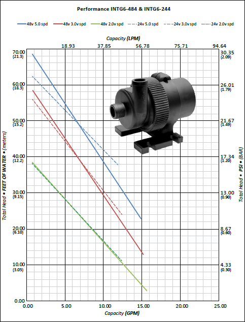 | INTG6-484 | 48 VDC | Analogico (0–5V nominale) o Digitale PWM | 3 fili (+), (–), SPD CTRL | 56,3 L/min (15,0 GPM) | 21 m (30,3 PSI) | 1 MHB (attacco a innesto per tubo flessibile) | EPDM |